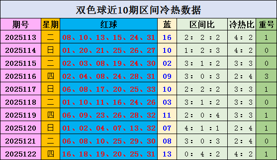 红球重号分析:上期红球开出1个重号,重号在前10期开奖中出现6期,共出现8个重号,本期预测不出现重号。