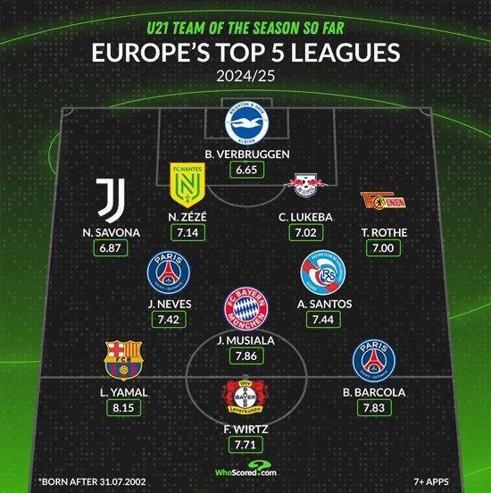 WhoScored笔据球员的评分列出了本赛季五大联赛U21最好气势,亚马尔、维尔茨、穆西亚拉在列。