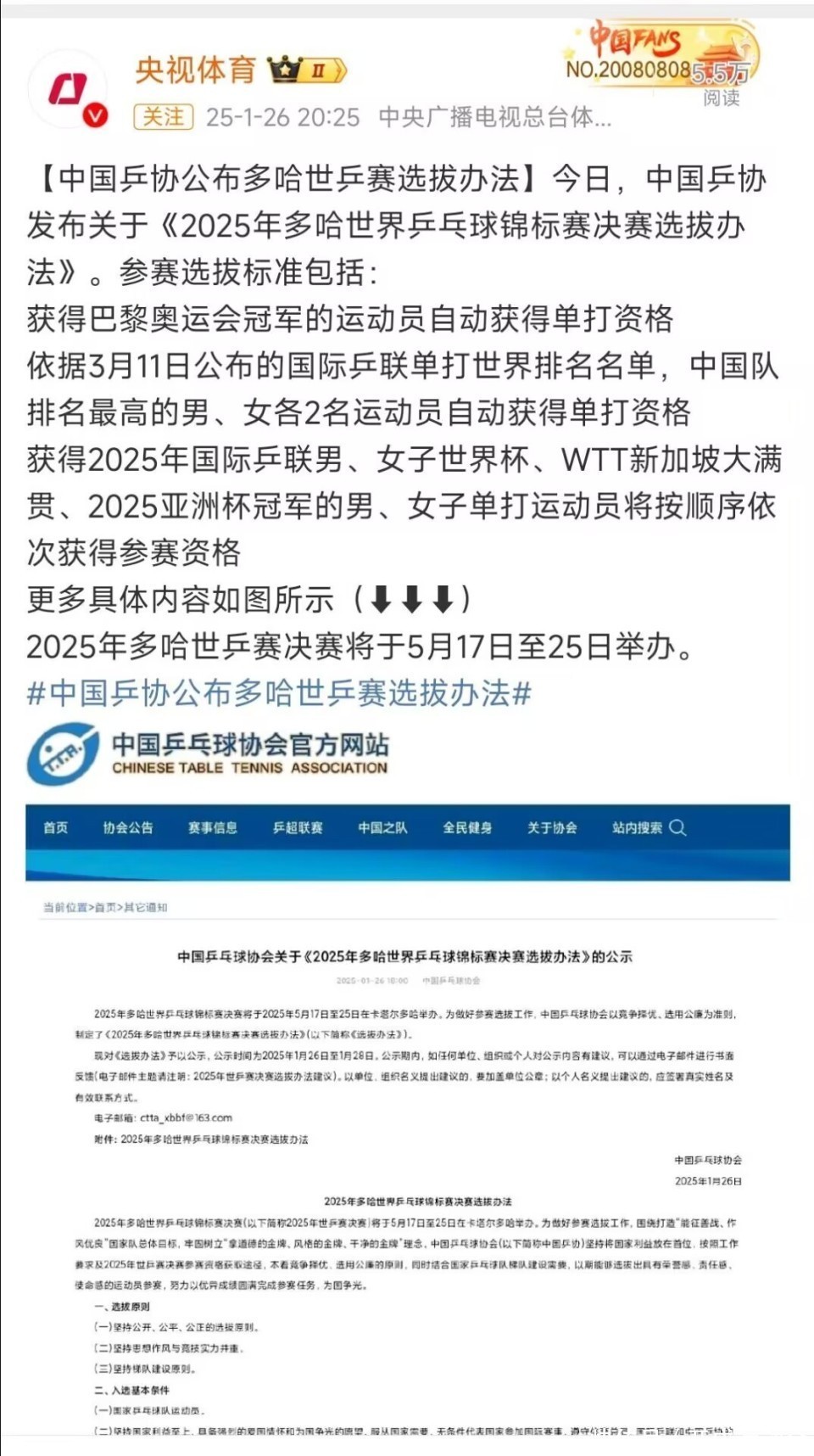 国乒协公布了2025年多哈世乒赛的遴荐认识,这意味着樊振东等东说念主无需历程寥落的遴荐要领即可径直干涉多哈世乒赛。